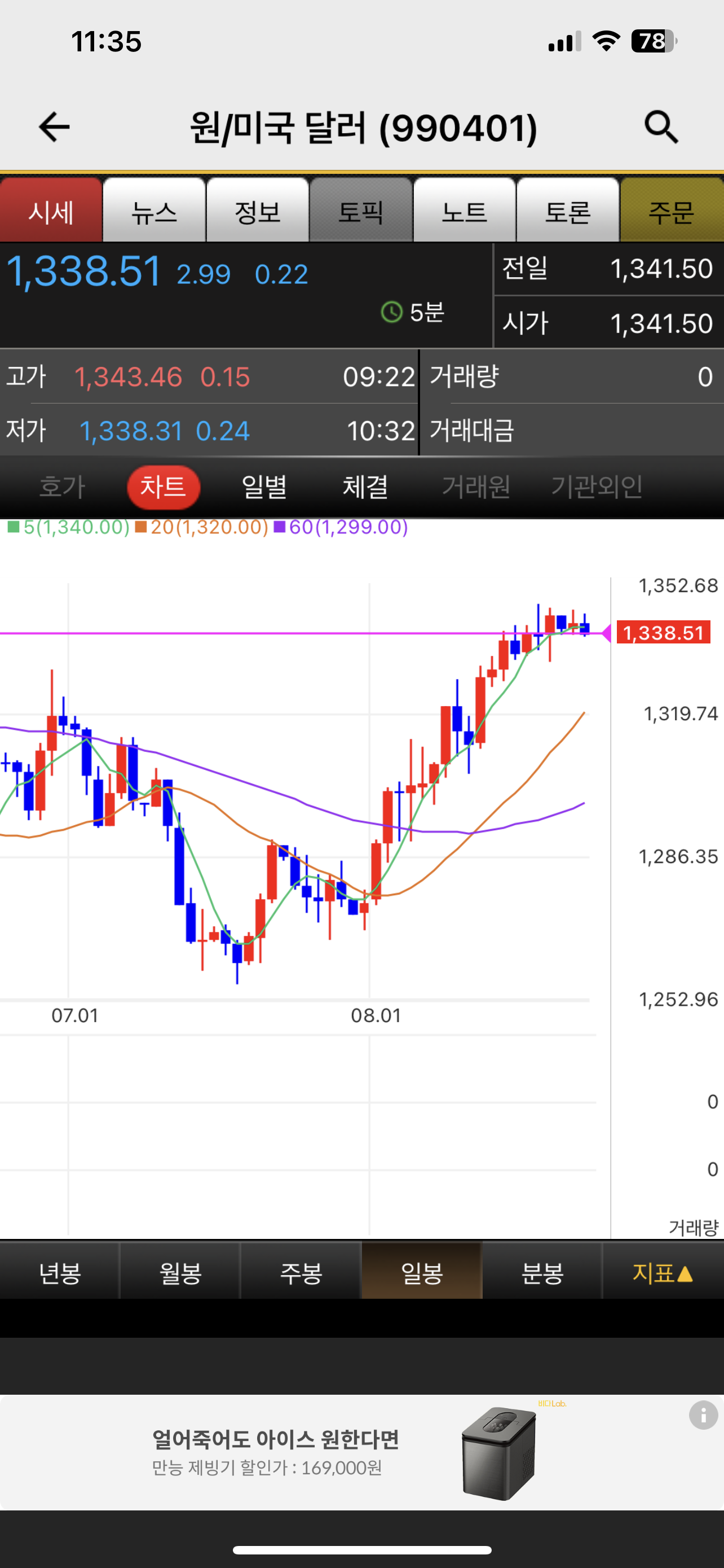 서울외환시간 기준 오전 11:35 기준 달러당 1,338.51원 거래중 ..단기적으로 외부변수가 없다는 전제하에 그래프 기울기,